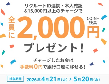 今回のキャンペーン特典はすべてCOIN+残高へ加算されます。COIN+残高は銀行口座へ無料で出金できます。