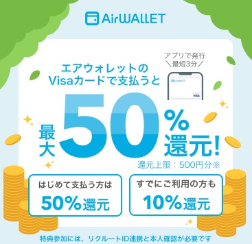 キャンペーン内容エアウォレットチャージ式Visaカードで支払うと、50%還元(新規)または10%(既存)