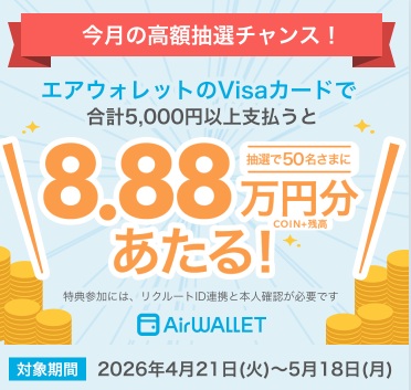 Visaカードで期間中合計5,000円以上支払うと、抽選で50名に8.88万円分のCOIN+残高プレゼント。
