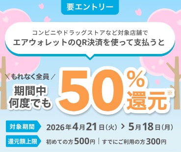 キャンペーン内容エアウォレットアプリ、または三菱UFJ銀行アプリのCOIN+でQR決済すると50%還元