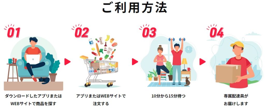イオンや西友などのネットスーパーのように指定の時間に配達してもらうのではなく、注文したらすぐに配達してくれるので急いでいるときなどは非常に便利です。これまで5回程度利用しましたが15分~25分の間でした。