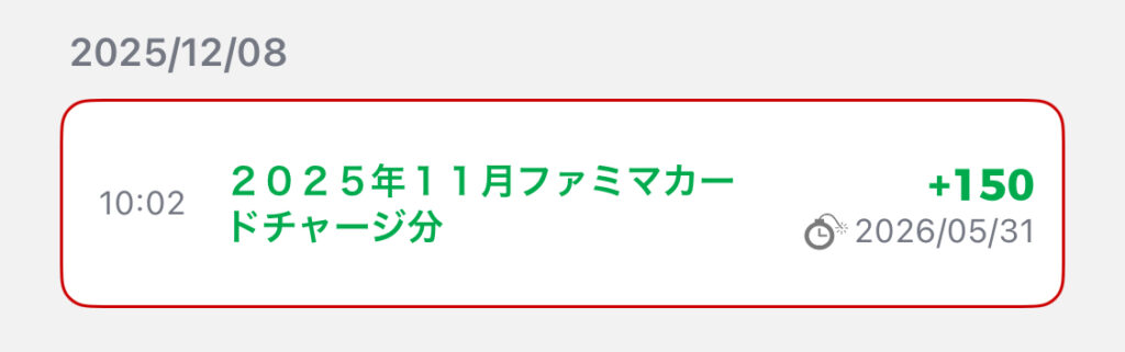 例)3万円チャージ→150ポイント付与(0.5%還元)