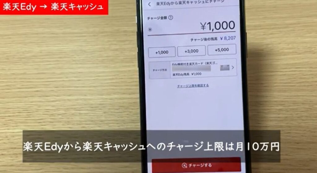楽天Edyから楽天キャッシュへのチャージは月10万円までです。