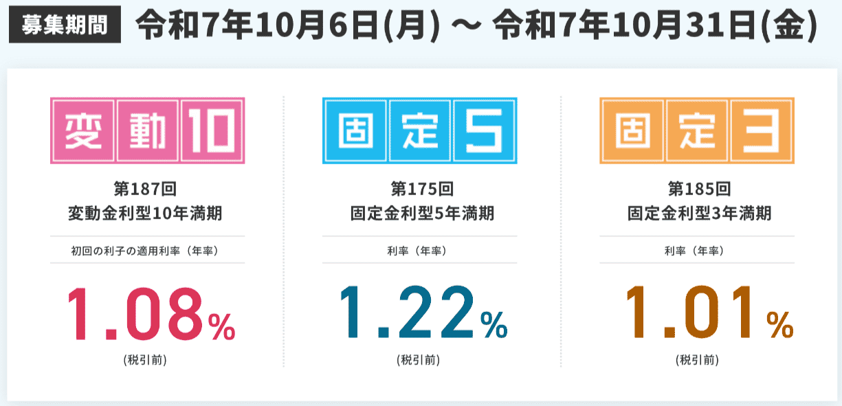 2025年10月6日から販売されている第187回の変動10年は利率1.08%とここ数年間で最も高い水準となっています。