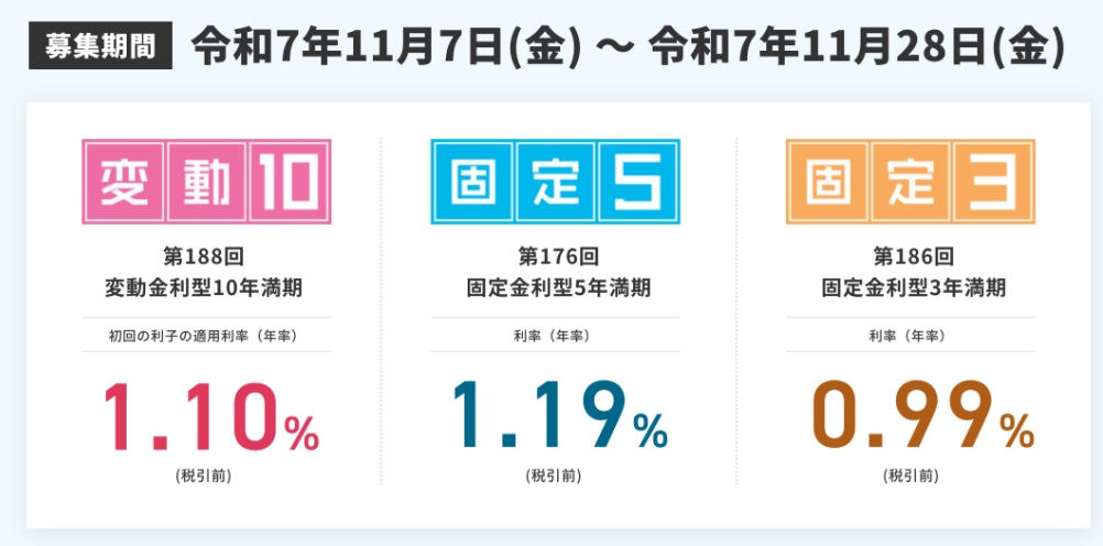 2025年11月7日から販売されている第188回の変動10年は利率1.10%とここ数年間で最も高い水準となっています。