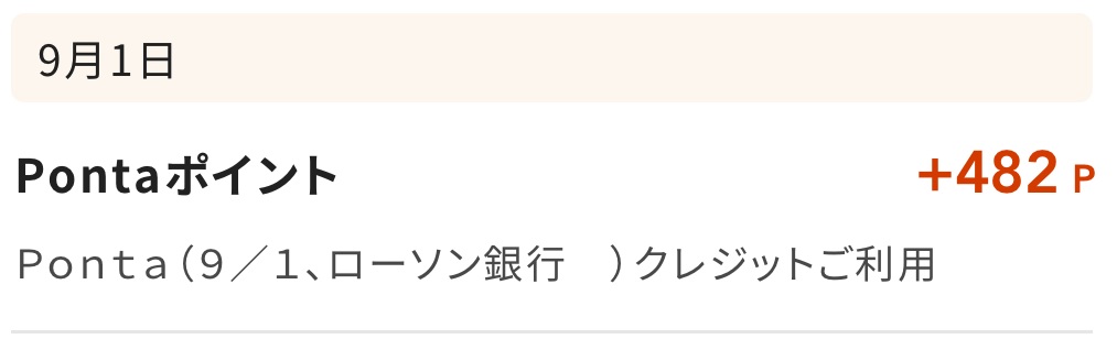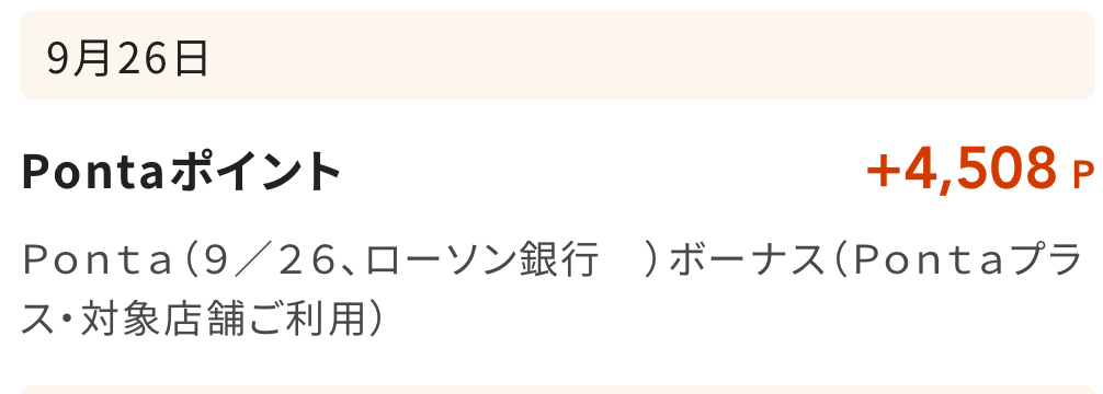 例えば、7/16~8/15利用分は、9/1に基本還元分(482P)、9/26に対象店舗利用分(4,508P)が付与されました👇