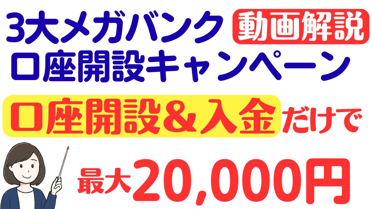 三大メガバンク(三菱UFJ銀行・三井住友銀行・みずほ銀行)では新規口座開設キャンペーンが実施されています。口座開設して入金するだけで2万円プレゼントetcかなりお得です!