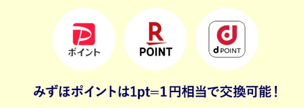 みずほポイントは、楽天ポイント・PayPayポイント・dポイントの共通ポイントや、Amazonギフトカード等のデジタルギフト券と1ポイント=1円相当で交換できます。