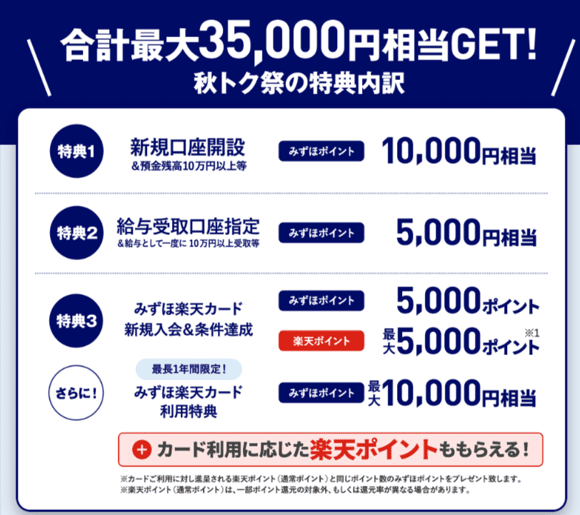 みずほ銀行では口座開設など各種条件達成で最大35,000円相当もらえる「秋トク祭」開催中です。最大の35,000円獲得するにはクレジットカード作成・利用などの条件達成が必要ですが、口座開設・入金だけでも1万円獲得できます。