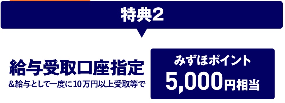 特典② | 給与受取 | みずほポイント 5,000円相当 | ・2024/9/30~2025/9/29に給与受取履歴なし ・2025/12/1~12/31に給与として1度に10万円以上受取り |