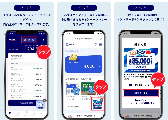みずほダイレクトアプリにログインし、みずほポイントモール内バナーよりエントリーできます。