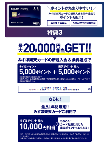 特典③ | みずほ楽天カード新規入会・利用 | みずほポイント 5,000円 楽天ポイント 最大5,000ポイント | ・2025/9/30~11/27申込、12/5まで発行 ・申込翌月末まで1回利用 ・翌々月25日まで引落口座設定 |