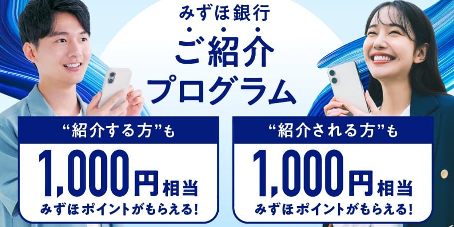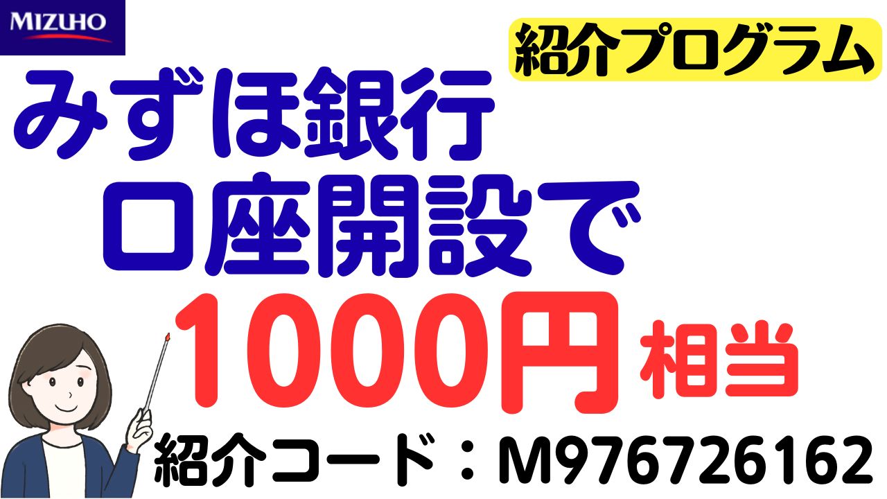 みずほ銀行の紹介プログラムでは、新規口座開設で1,000円分が獲得できます。招待コードを探している方は是非ご利用ください。