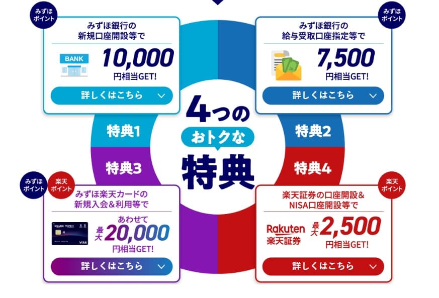 | 特典④ | 楽天証券&NISA口座開設など | ・1/27~6/19までに楽天証券口座・NISA口座開設 ・1/27~6/26までに投信積立約定 →みずほポイント最大2,500円相当 |