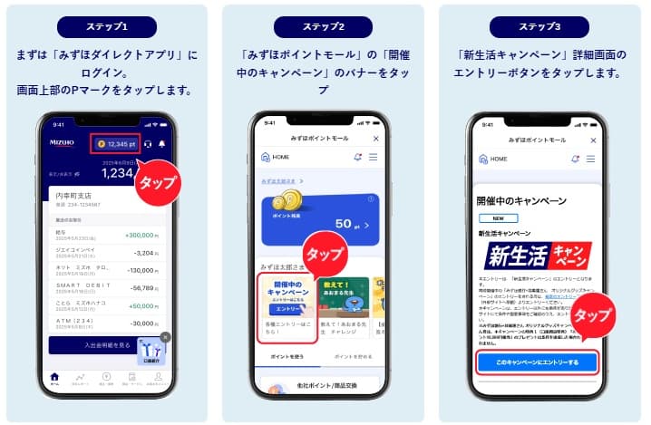 口座開設後、みずほダイレクトアプリにログインし、みずほポイントモール内の「新生活キャンペーン」バナーよりエントリーできます。