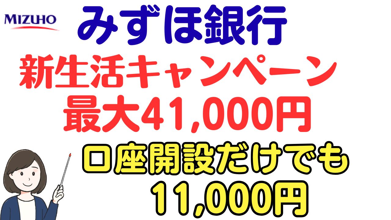 みずほ銀行では口座開設など各種条件達成で最大41,000円相当もらえるキャンペーンが開催中です。最大の41,000円獲得するにはクレジットカード作成などの条件達成が必要ですが、口座開設・入金だけでも11,000円を獲得できます。