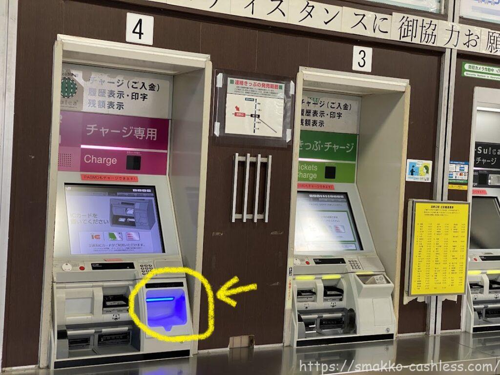 駅に設置されているの自動券売機やチャージ機の多くはSuicaカードを入れる場所はありますが、スマホをかざす場所がないためモバイルSuicaへのチャージができません。