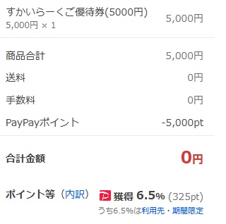 例えば、すかいらーく優待券5,000円分を購入した場合、325ポイント還元(6.5%還元)です。