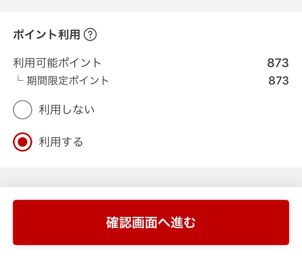支払いの途中でポイント利用の画面(下の画像参考)がでてくるので、そこで利用するを選ぶとポイントが利用されます。