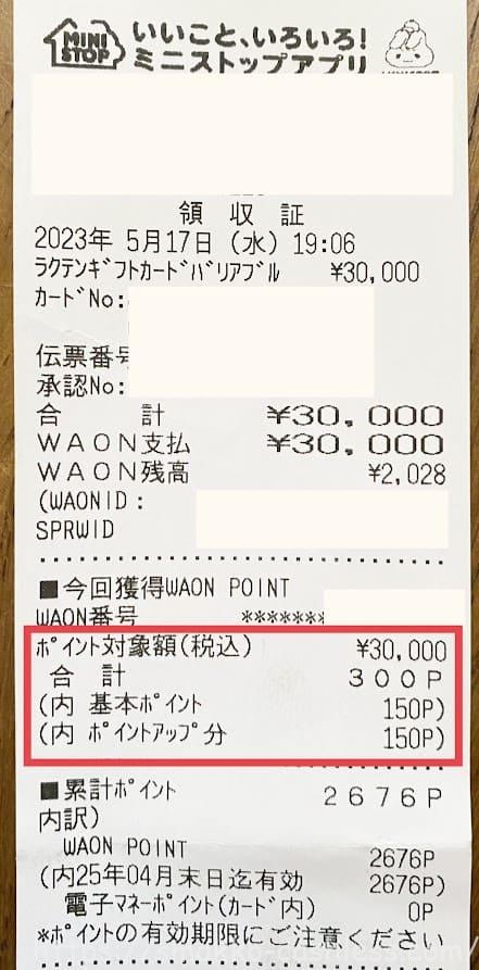 ▼ミニストップでWAONで3万円分の楽天ギフトカードを購入したときのレシート