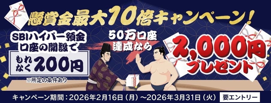 >>目指せ50万口座!SBIハイパー預金懸賞金最大10倍キャンペーン!