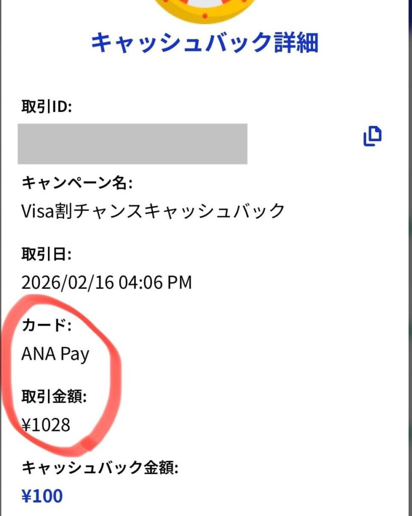 仮に1回の決済が5,000円で、ANA Payで支払った場合、Visa割の実質還元率は約3.1%。これにANA Payの基本還元率0.5%を加えると、合計で約3.6%還元になり、十分高水準です。