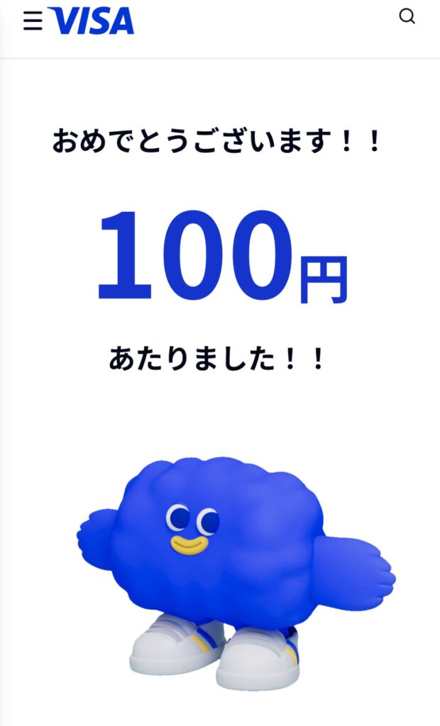 Visa割キャンペーンが始まりました。スマホのタッチ決済で1,000円以上支払うと、その都度くじが引け、ハズレはありません。