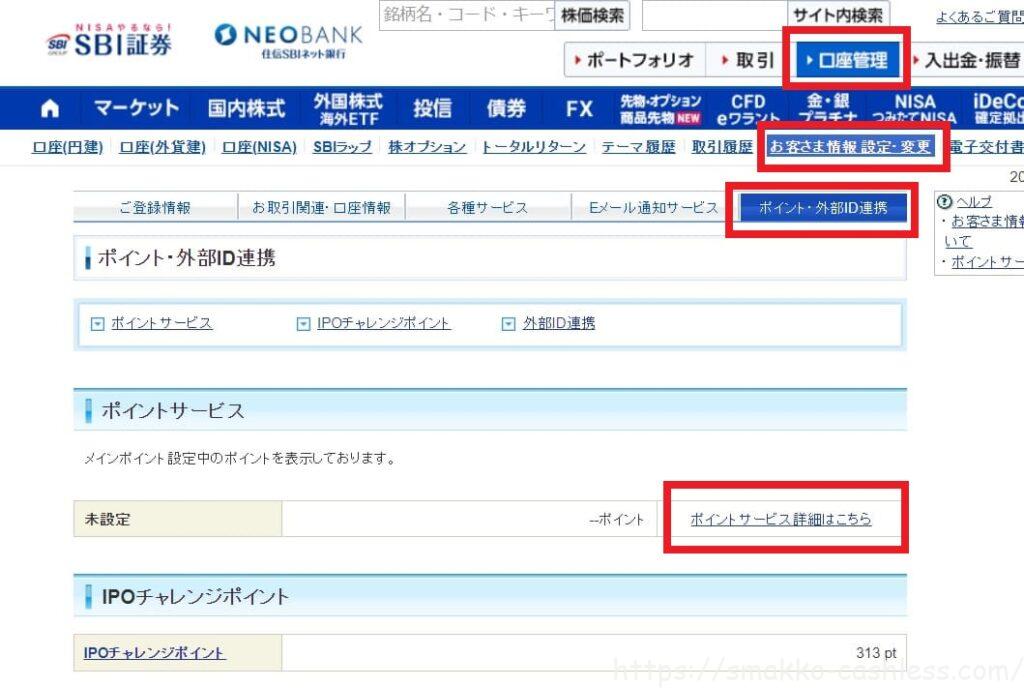 ①「口座管理」>「お客さま情報設定・変更」>「ポイント・外部ID連携」のポイントサービスにある「ポイントサービス詳細はこちら」をクリックします。