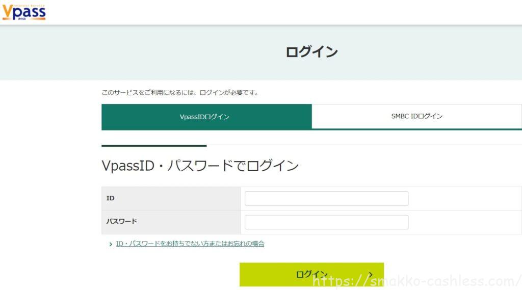 ⑤Vpassのログイン画面になります。Vpass IDかSMBC IDのどちらかでログインします。三井住友カードや三井住友銀行を利用していればVpass IDかSMBC IDがありますが、わからない場合には三井住友カードや三井住友銀行に問い合わせるなどしてください。