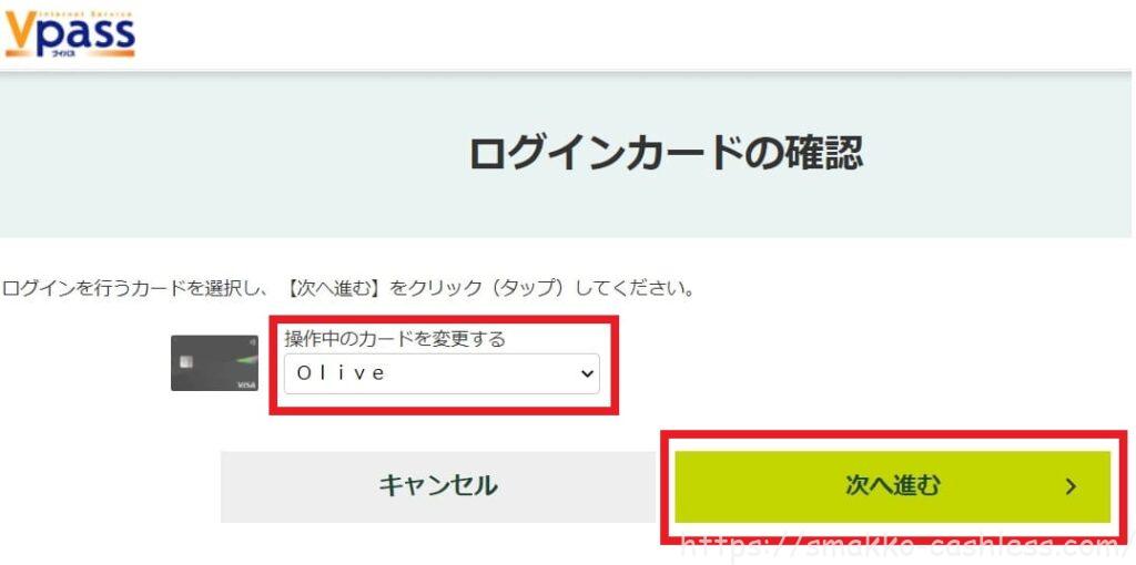 ⑥ログインを行うカードを選択して「次へ進む」をクリックします。