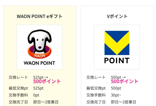 手数料が気になる方は、ポイントサイトのポイントを一度Vポイントに交換して(等価交換)、VポイントをWAON POINTに交換するすれば手数料なしで交換できます。