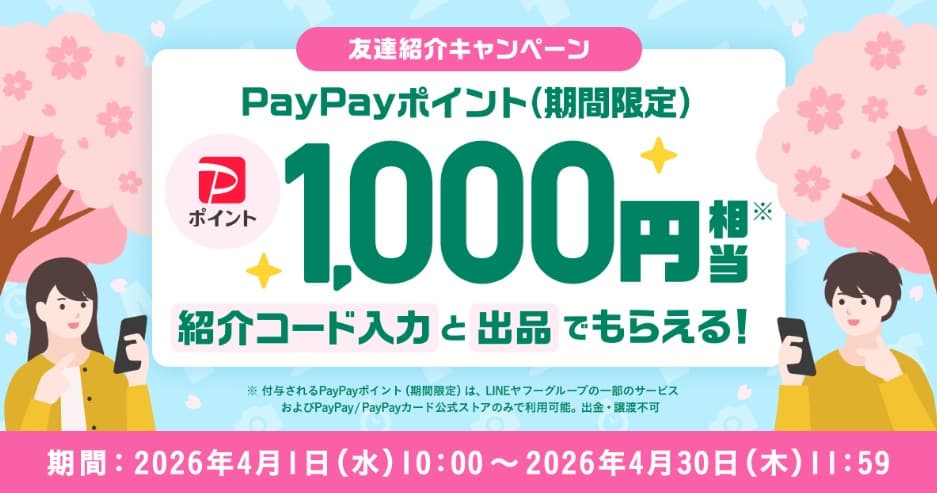 PayPayアカウントと連携して、紹介コード【VBCVL2】を入力、期間内に出品すれば、1000円相当のPayPayポイント(期間限定)が付与されます。