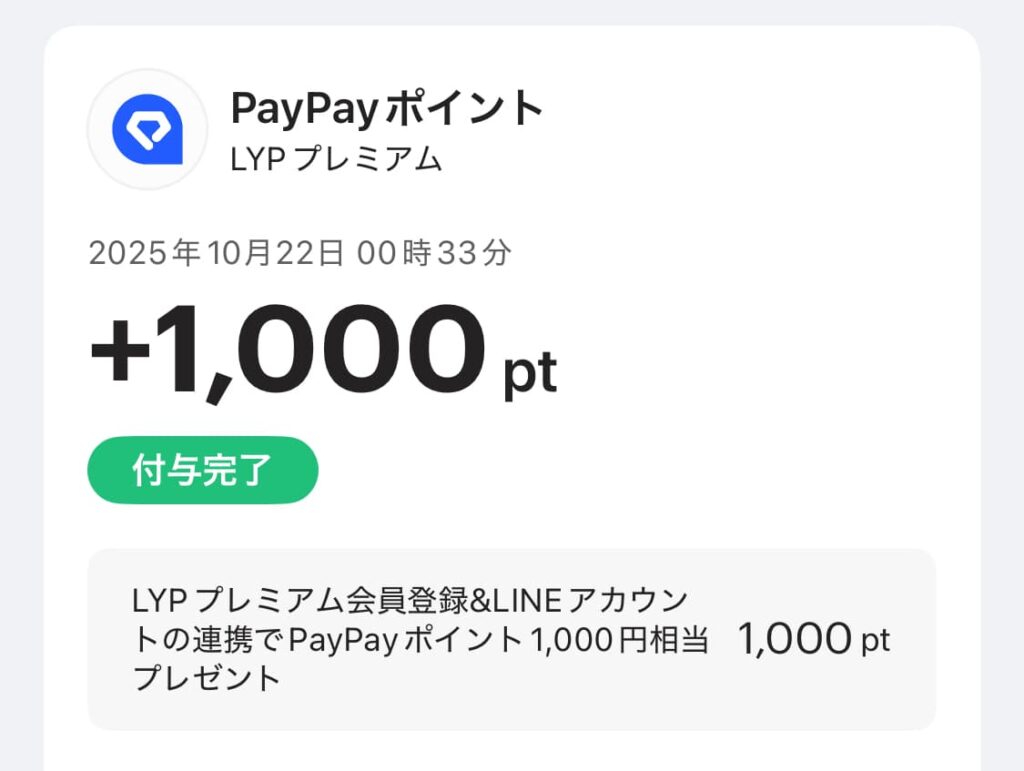 PayPayポイントは「2カ月後の中旬〜下旬の間」付与されるとのことでしたが、8月にLYPプレミアムに登録して10月22日に付与されました。